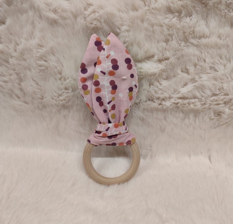 Les matières : Anneau en bois de hêtre naturel non traité et oreilles en coton imprimé Oeko-Tex doublé d'éponge 100% coton.